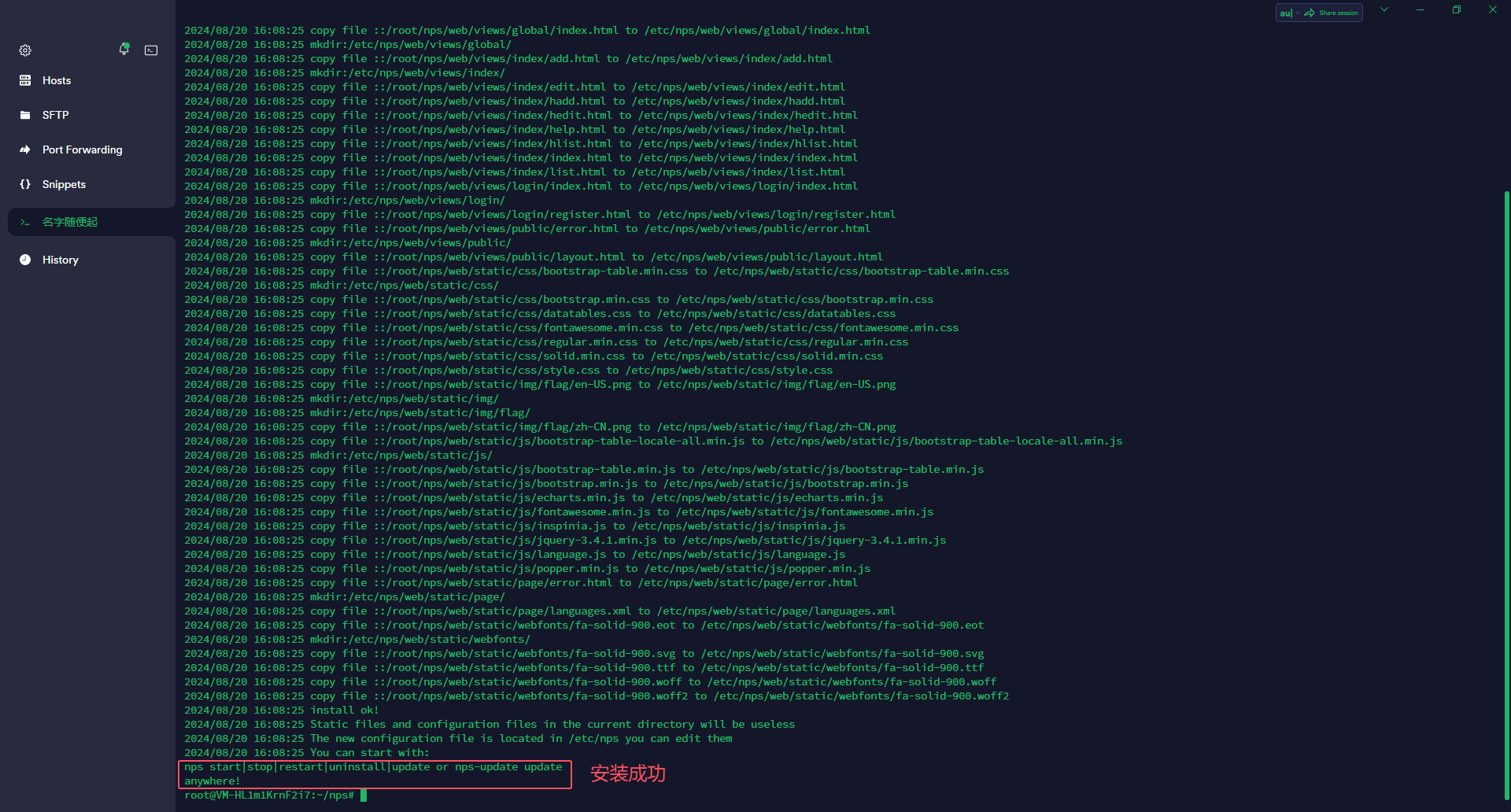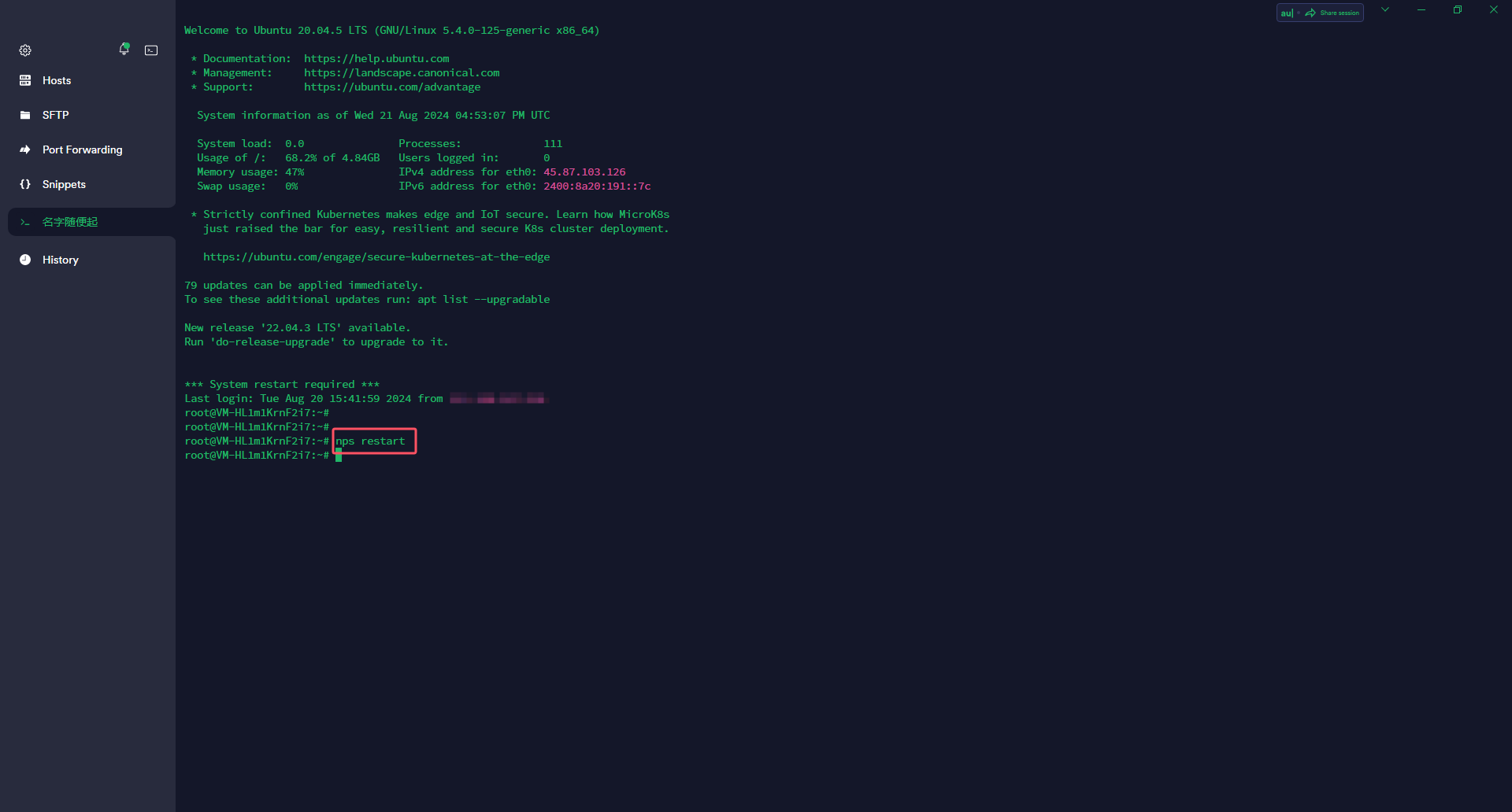 然后在 Termius 终端输入 nps restart ,即可重启 NPS 服务端