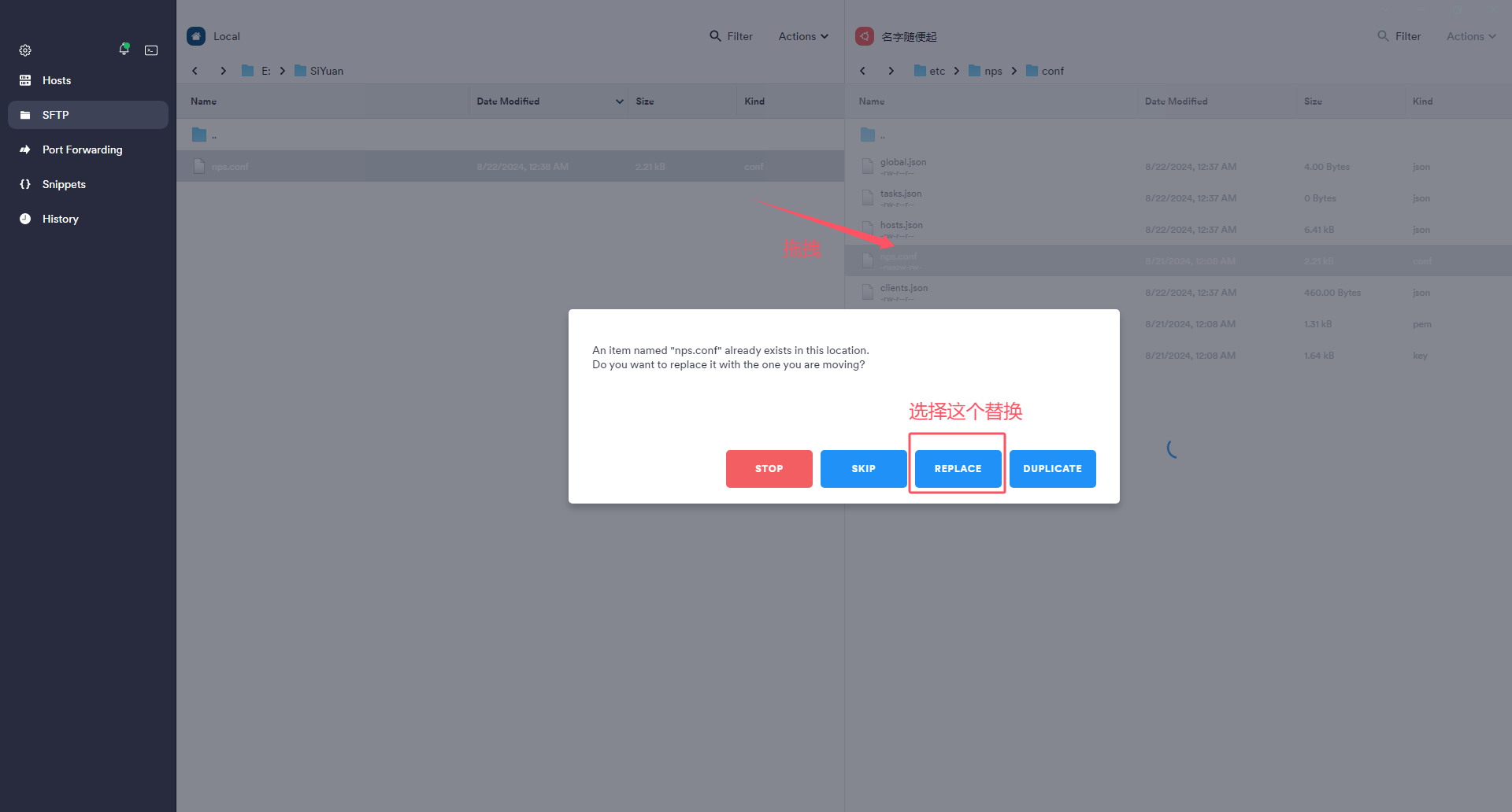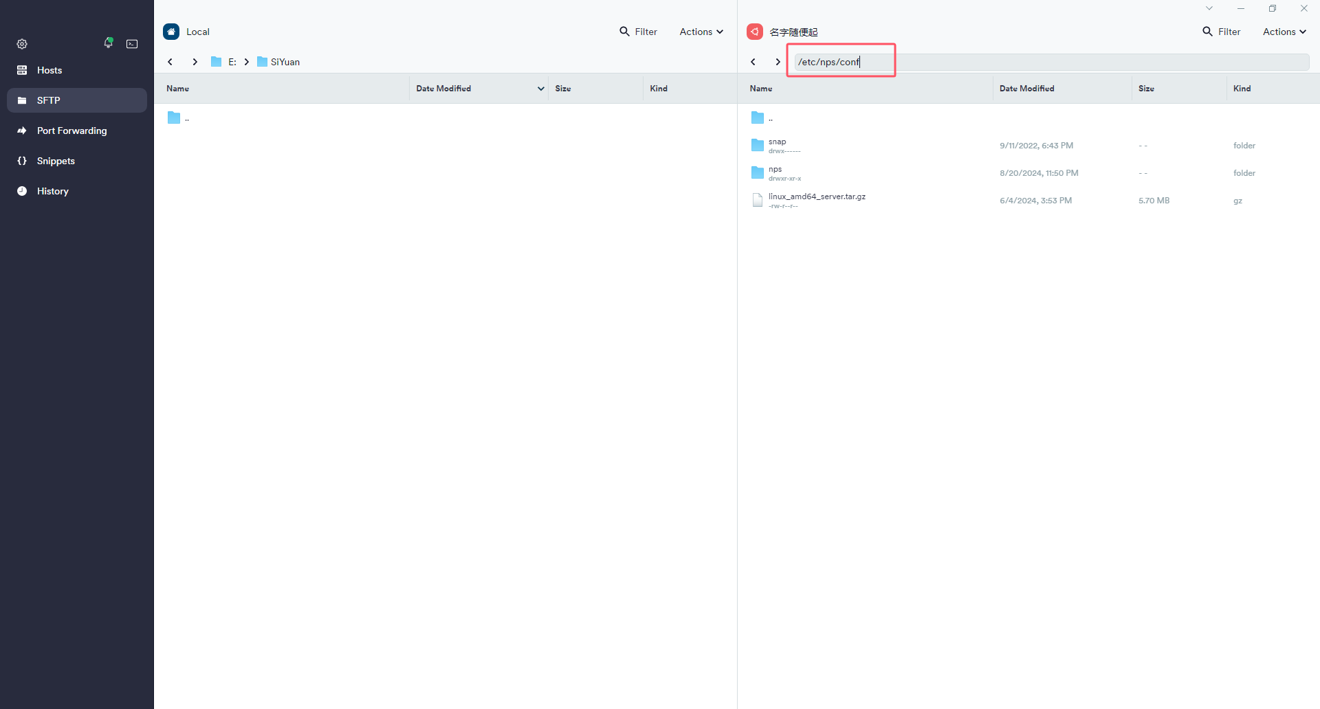 修改完以后,记得 Ctrl+S 保存,然后把 nps.conf 文件拖拽回 Termius 的 SFTP 界面,就能上传到云服务器的 /etc/nps/conf/ 目录下了~