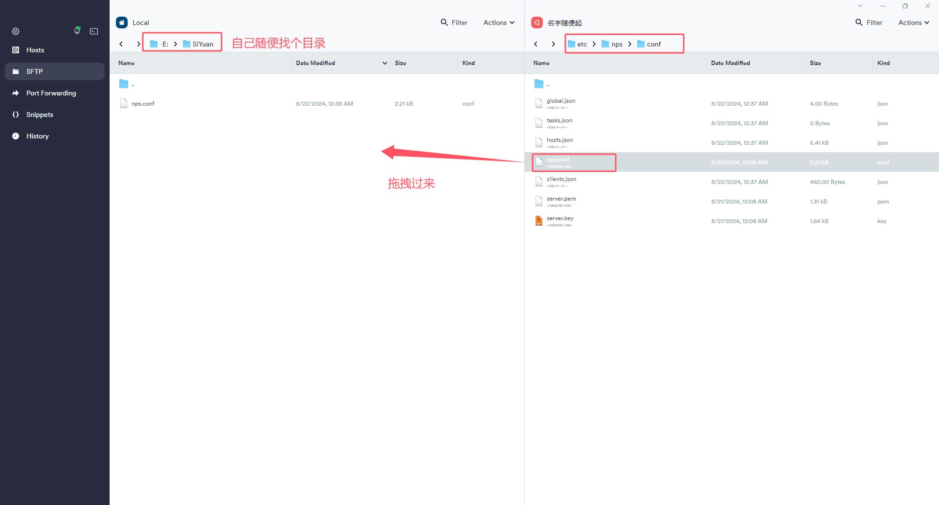 把 nps.conf 文件拖拽到左边,放到自己电脑上一个比较容易找的目录下~