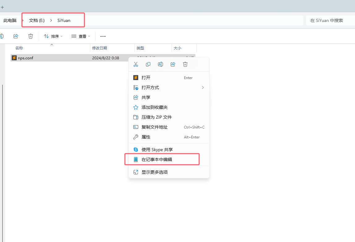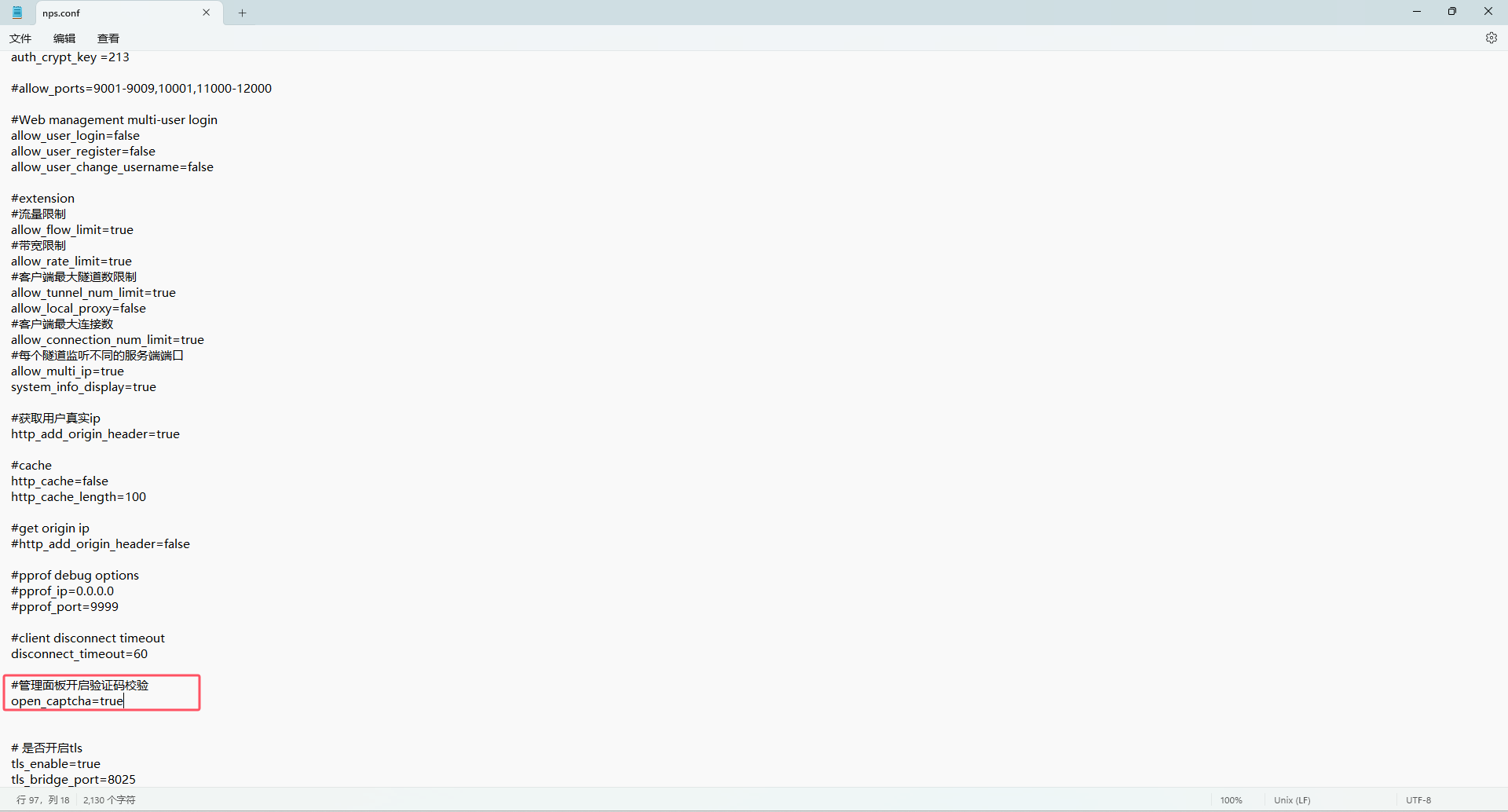 然后用记事本打开 nps.conf 文件,就能看到配置文件的内容了,如下图