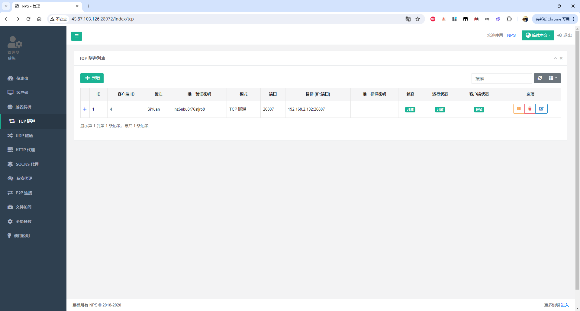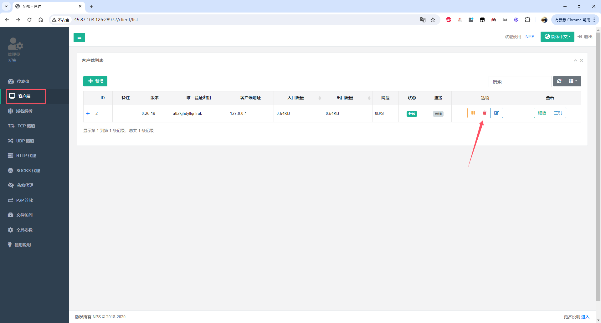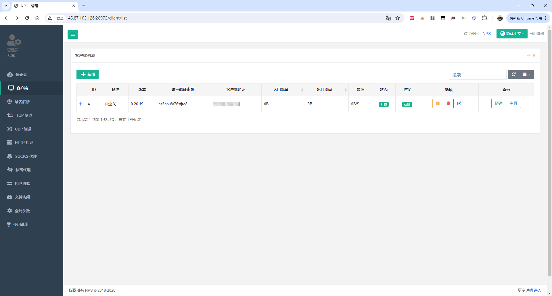 这是再返回到 NPS 的管理界面,点击左侧的 客户端 ,刷新就能看到我们刚刚配置的 NPC 客户端连接成功了~