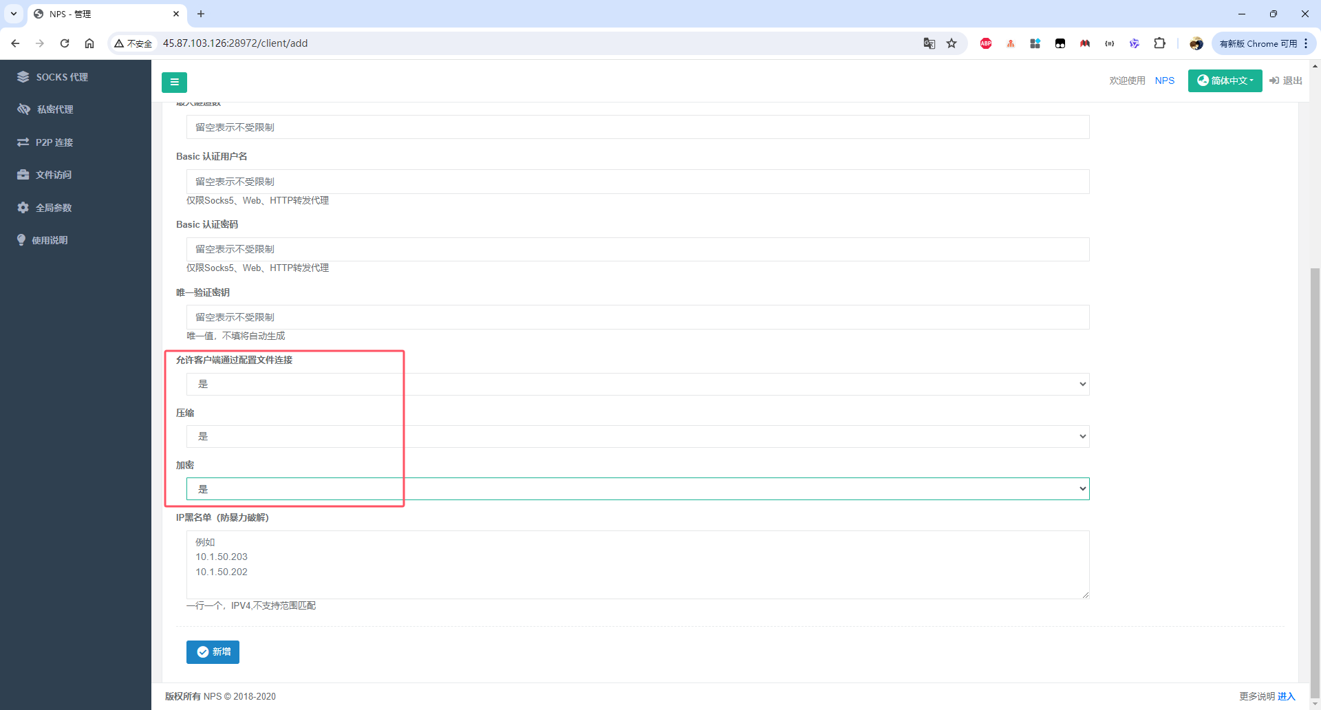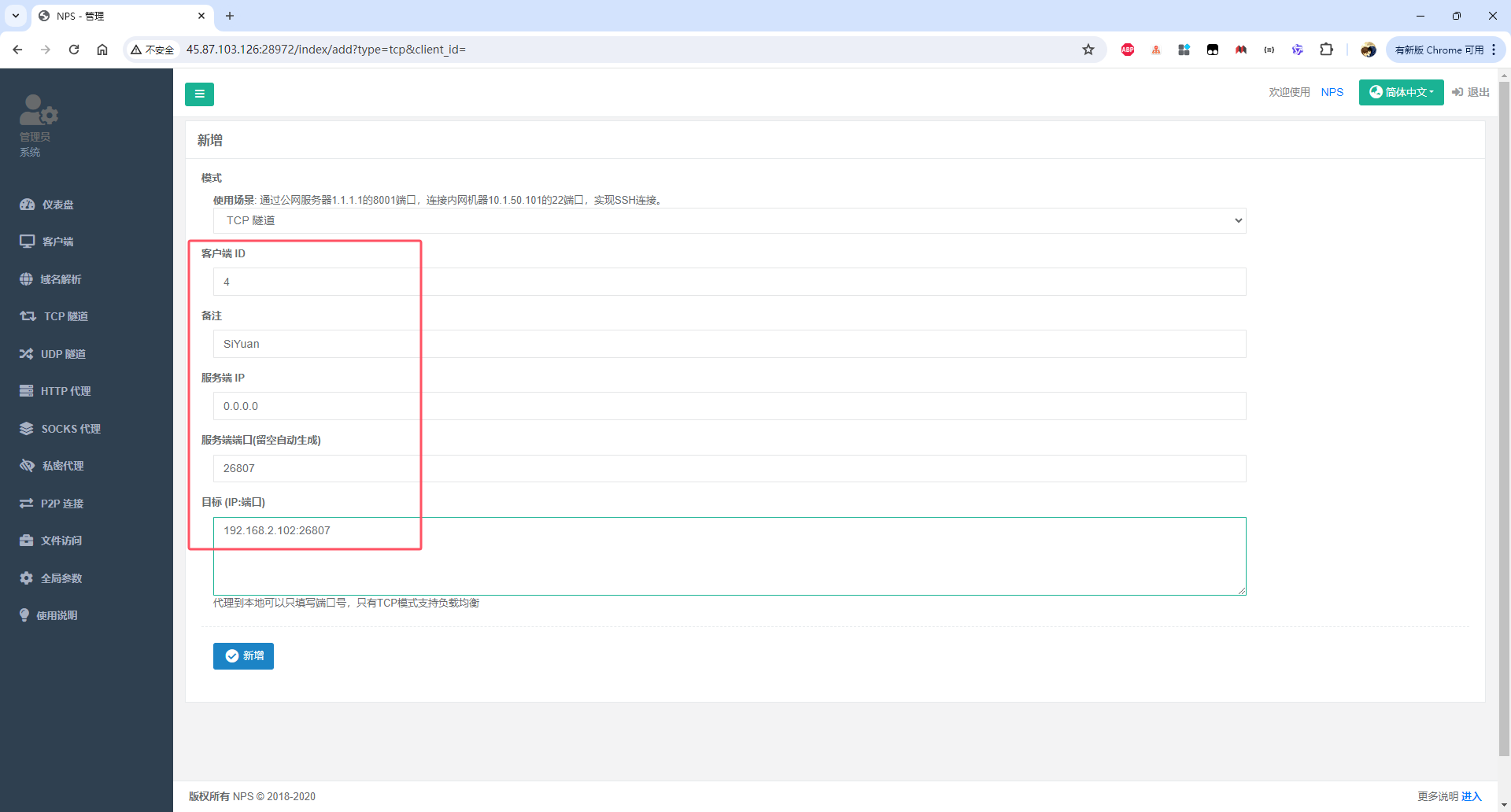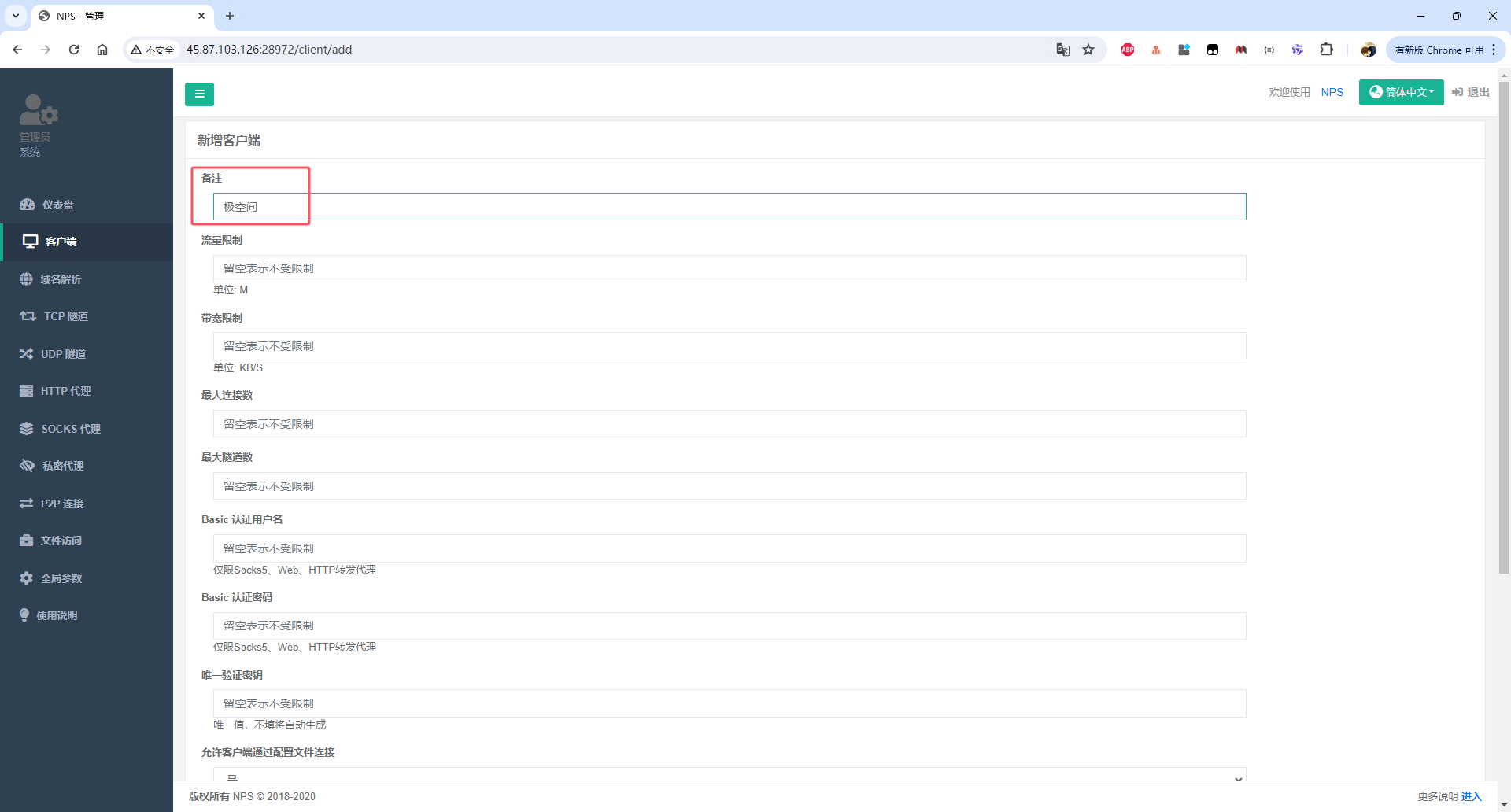 用我们在配置文件中的用户名和密码登录,进入 NPS 的管理界面,然后点击左边的 客户端 ,可以看到有一条默认的数据
