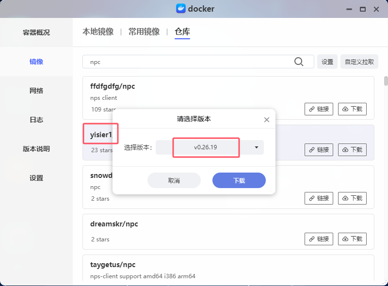在极空间 Docker 仓库里搜索 npc,选择 yisier 大佬的,当前最新版本是 v0.26.19,点击下载