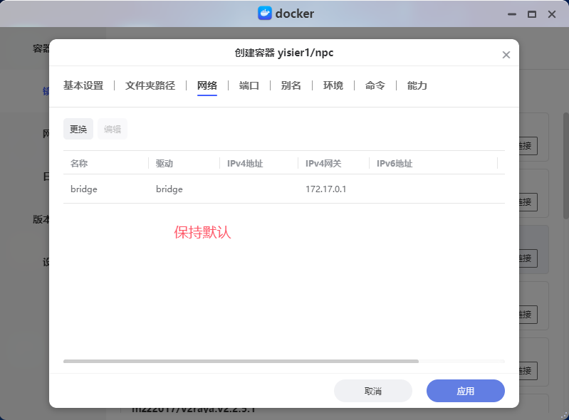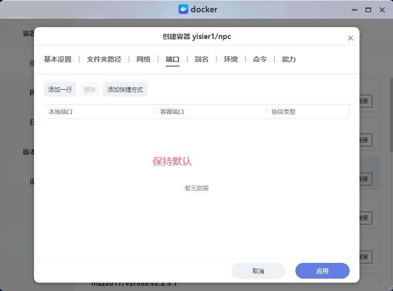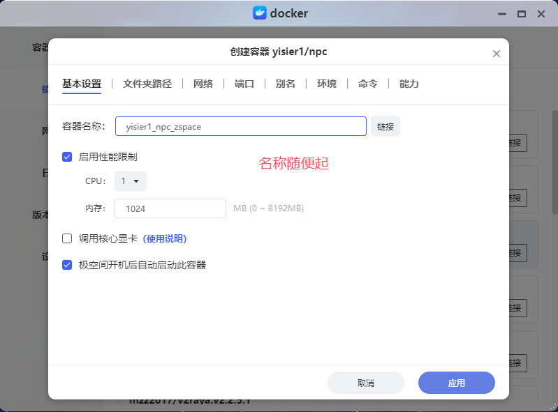 配置文件弄好后,就可以双击 npc 镜像,按如下配置创建 npc 容器: