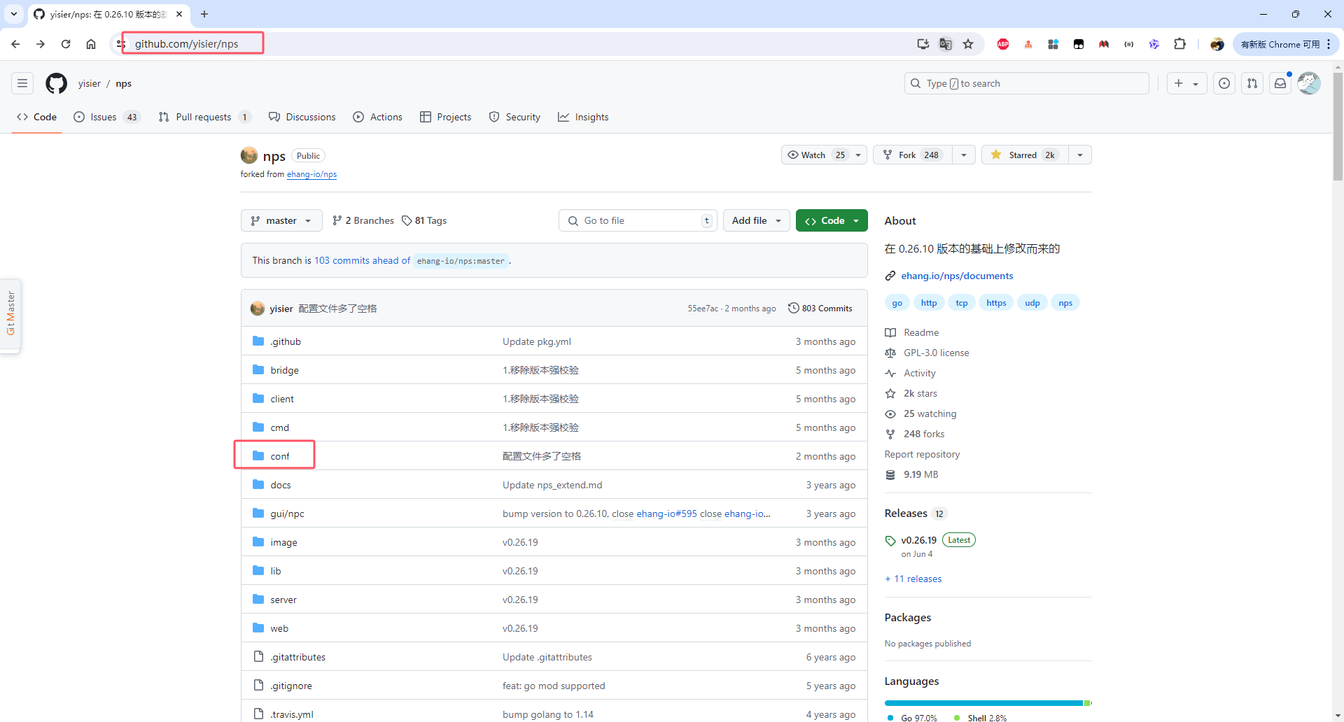 npc 的配置文件 conf 目录可以在 GitHub 仓库里下载,地址是:https://github.com/yisier/nps