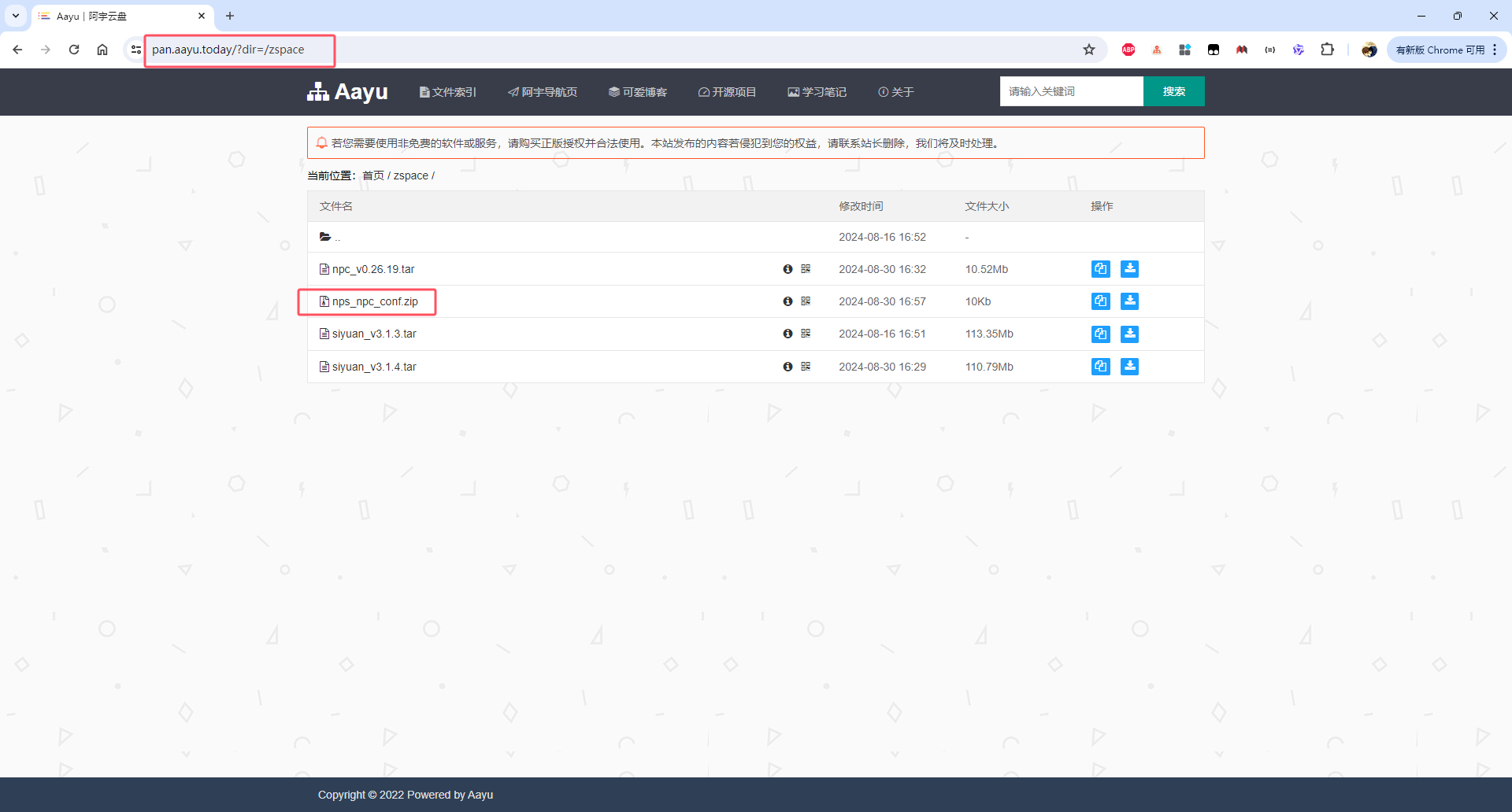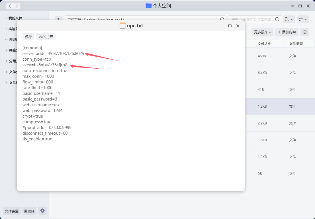 如果 GitHub 不好访问的话,也可以在我的 阿宇云盘 里下载 npc 的配置文件 conf 目录压缩包,解压后,上传到极空间自己的目录下