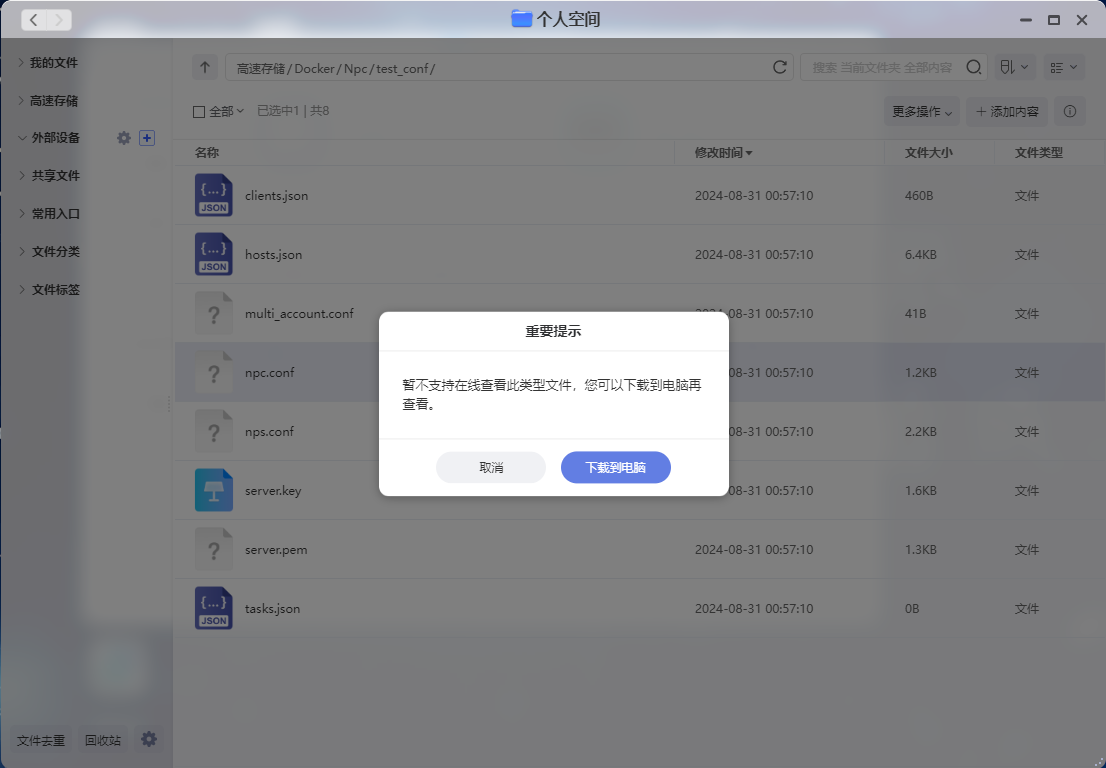 在正式创建 npc 容器前,需要先编辑下 npc.conf 文件,如果在极空间直接双击 npc.conf 文件,会弹出不支持在线编辑的提示框