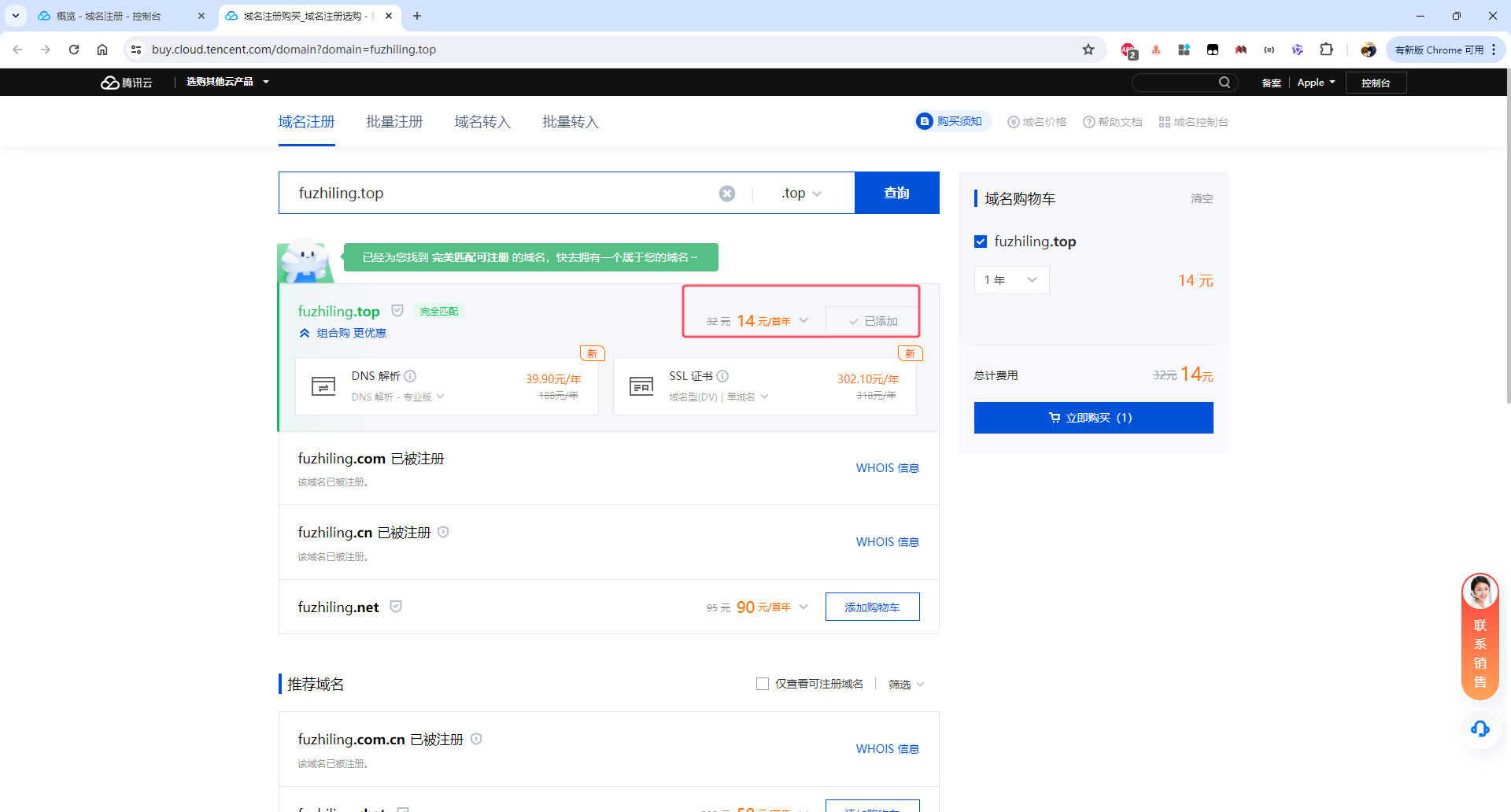 腾讯云域名注册地址:https://console.cloud.tencent.com/domain