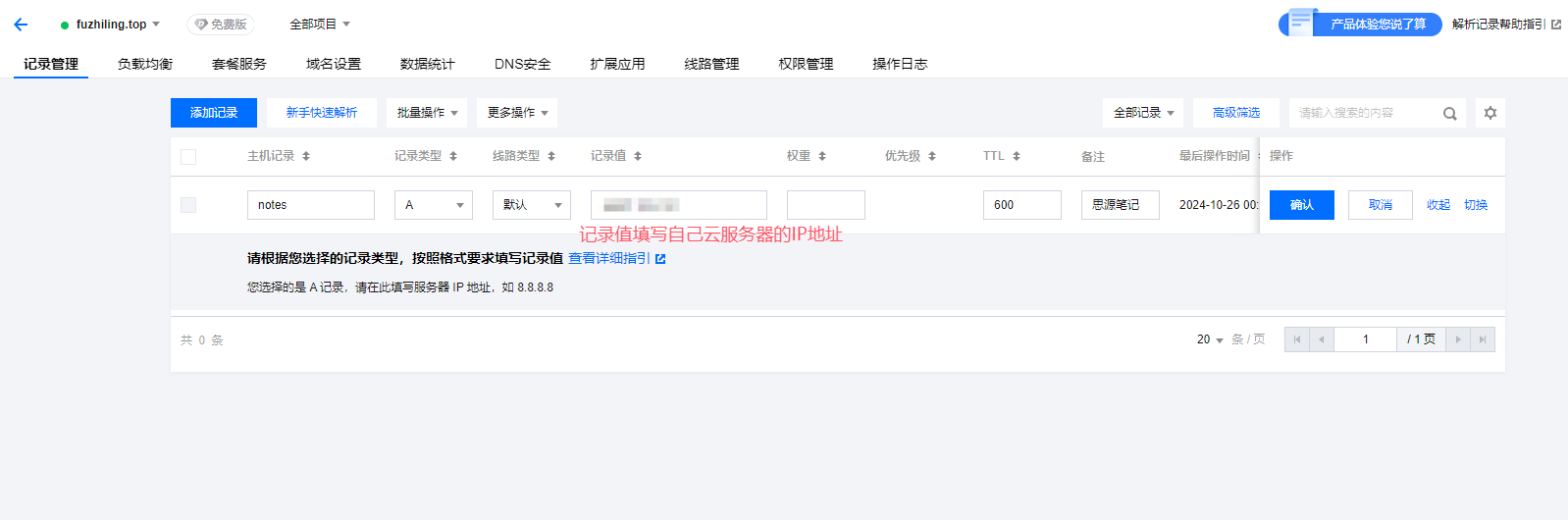 这里因为部署的是笔记服务,所以我就在主机记录里填写 notes,这样就能通过 notes.fuzhiling.top 访问到思源笔记了~