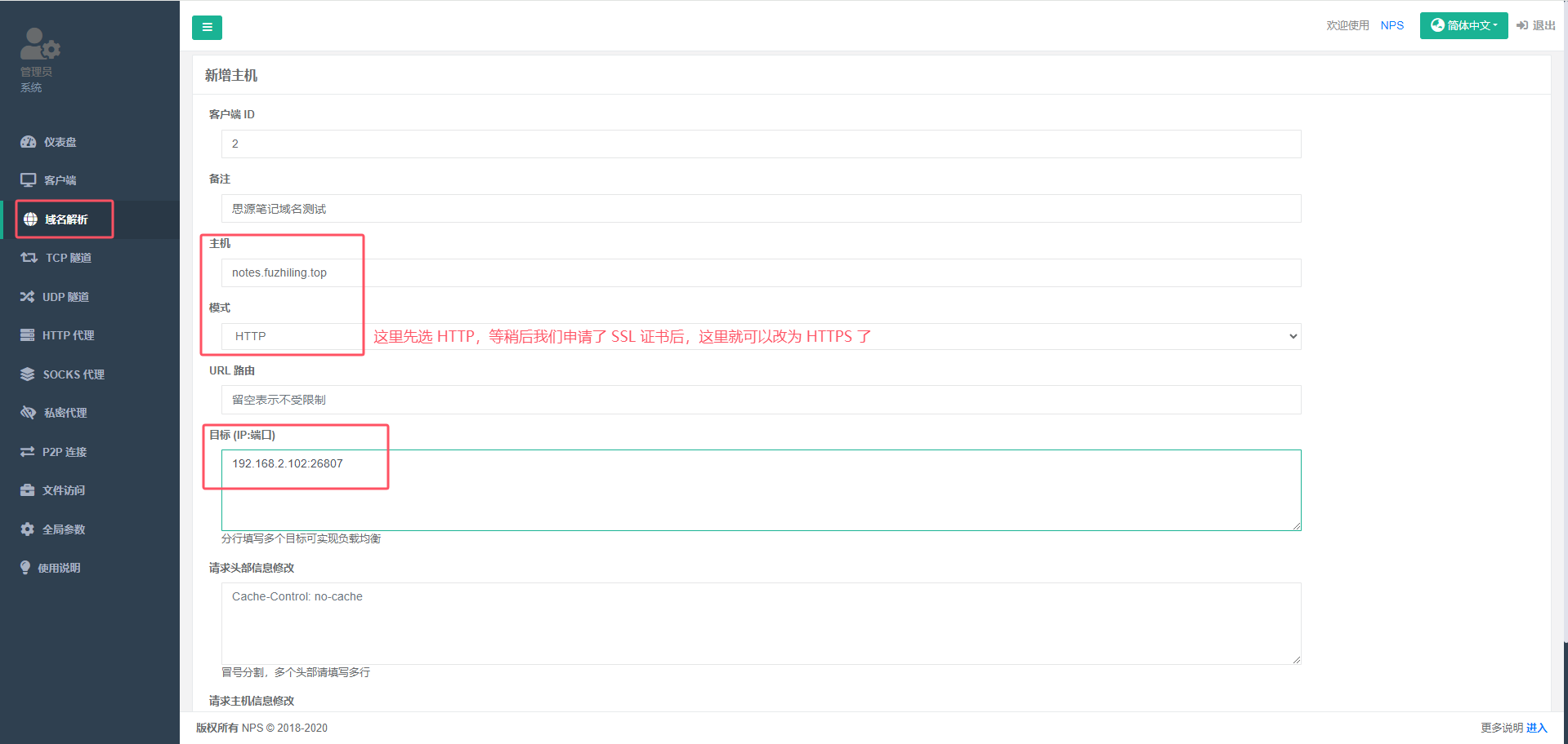 趁这段时间,我们先返回 NPS 管理界面,点击域名解析,然后点击新增,填写内容如下: