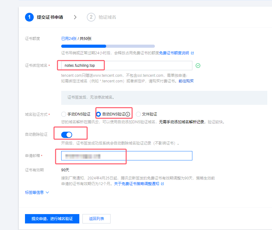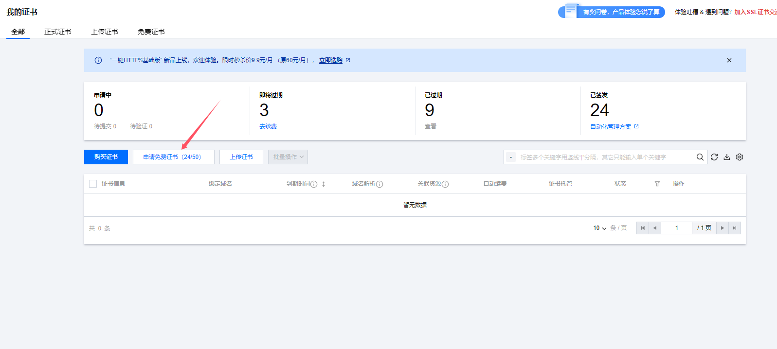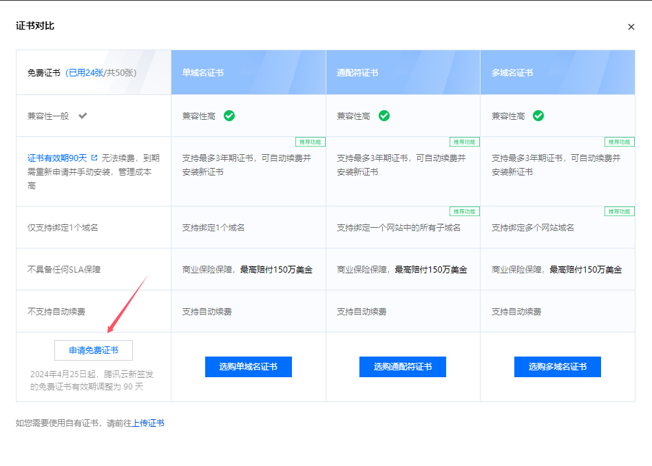 点击申请免费证书按钮,每个人有 50 个免费证书名额,所以最多可以申请 50 个域名的证书~