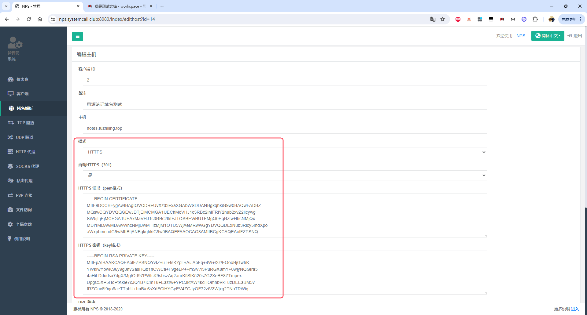 下载完后解压缩,然后返回我们的 NPS 管理界面,编辑我们之前配置的域名解析,首先将「 模式 」从 HTTP 改成 HTTPS