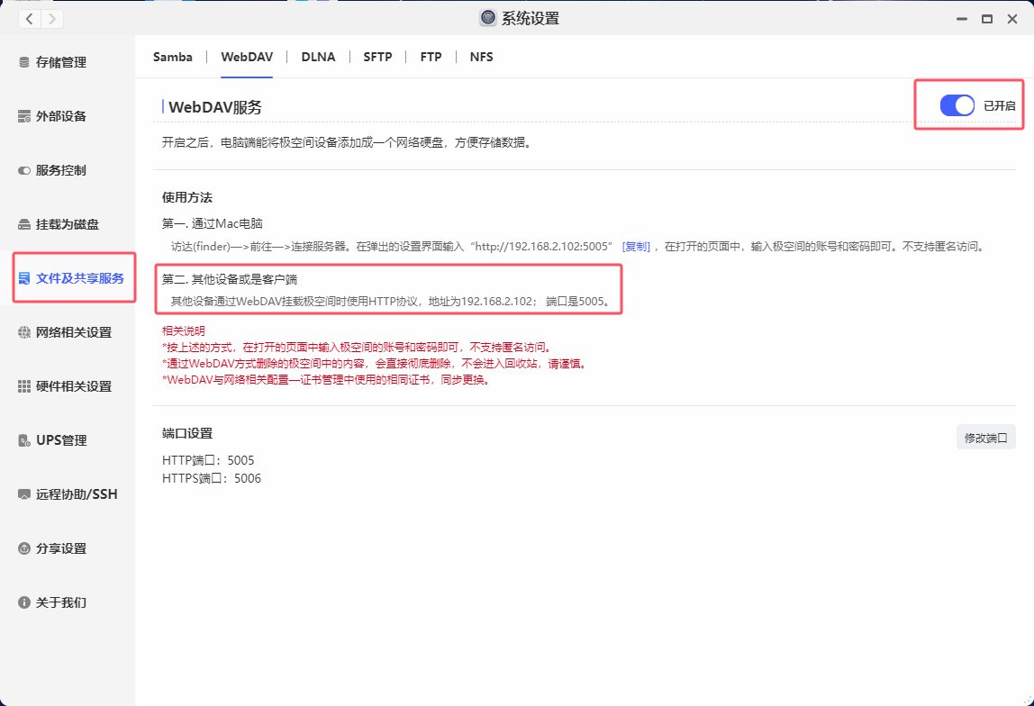 首先需要在极空间系统设置里,开启 WebDAV 服务,如下图