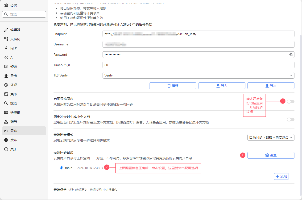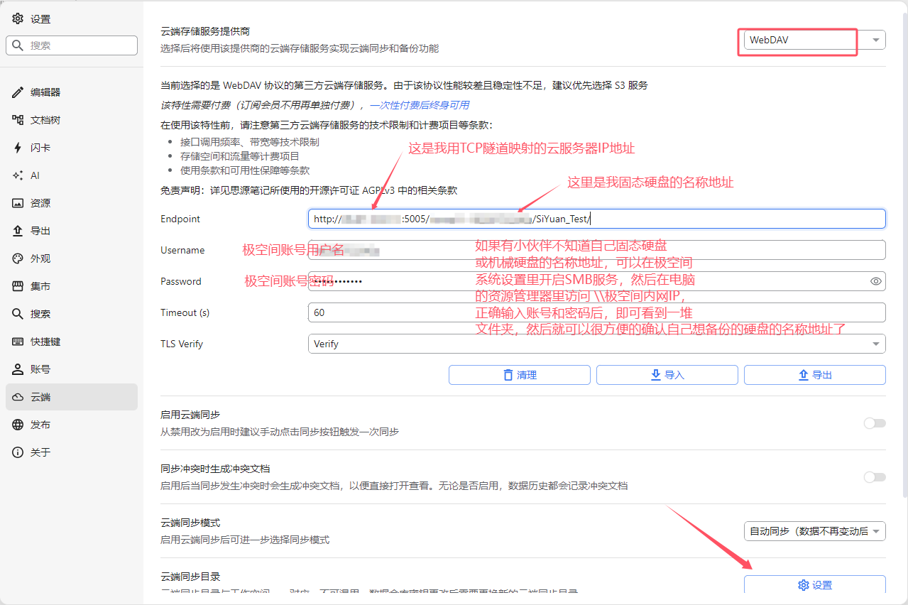 然后在设置里点击云端,在下拉框里选择 WebDAV,然后填写 Endpoint 、 Username 、 Password