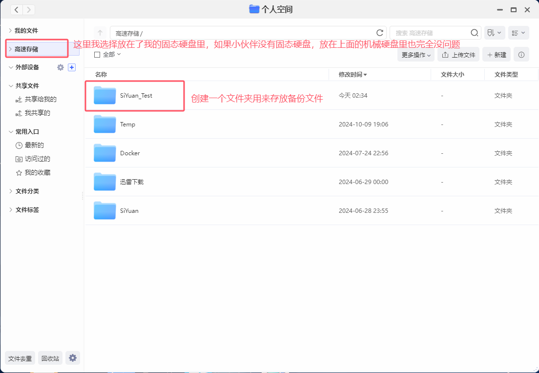 然后我们可以在个人空间里创建一个文件夹,专门用来存储思源笔记备份文件