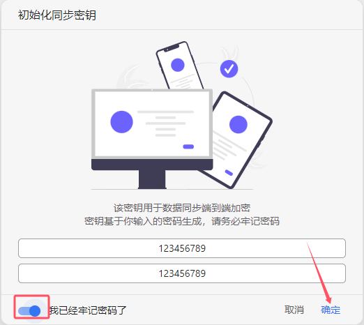 我们把设置界面关掉,然后点击左上角的同步按钮,就会看到「 初始化同步密钥 」的弹出框了,输入一个自己能记住的密码,然后点击确定