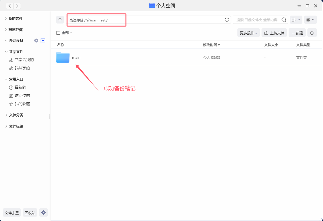 当然,创建一个中文的二级目录名称,也是没问题的,这里我就将笔记备份到默认出现的 main 目录下