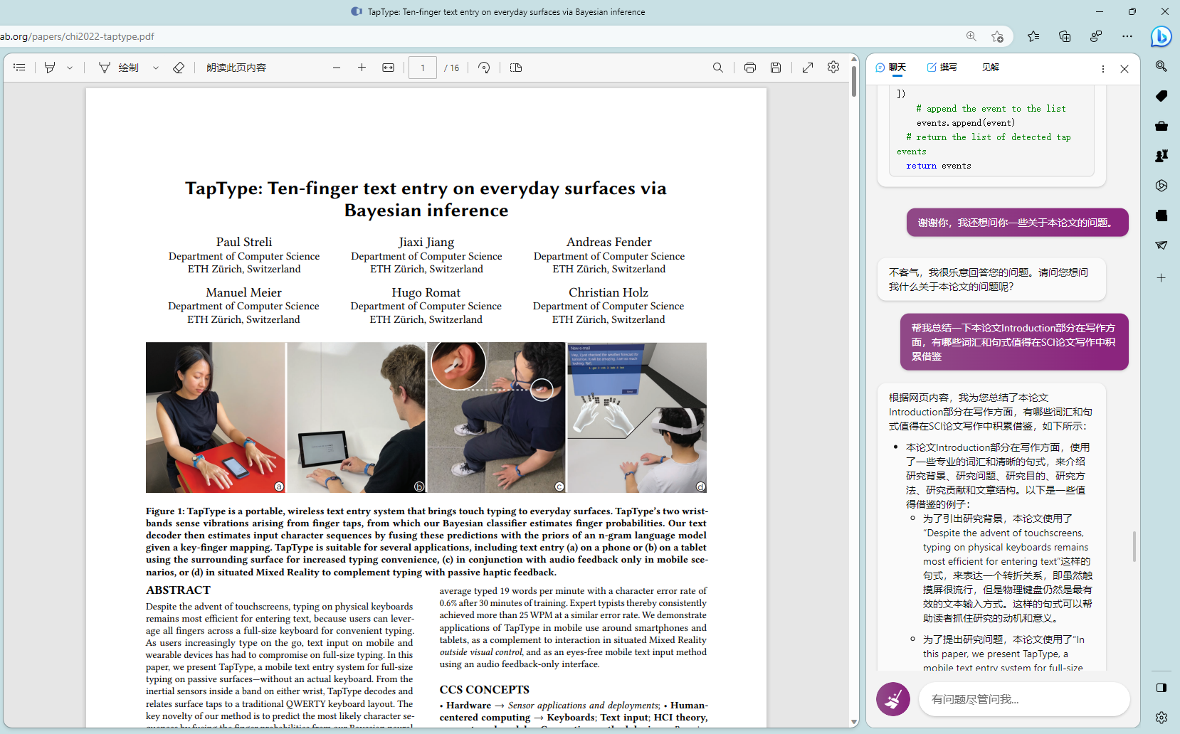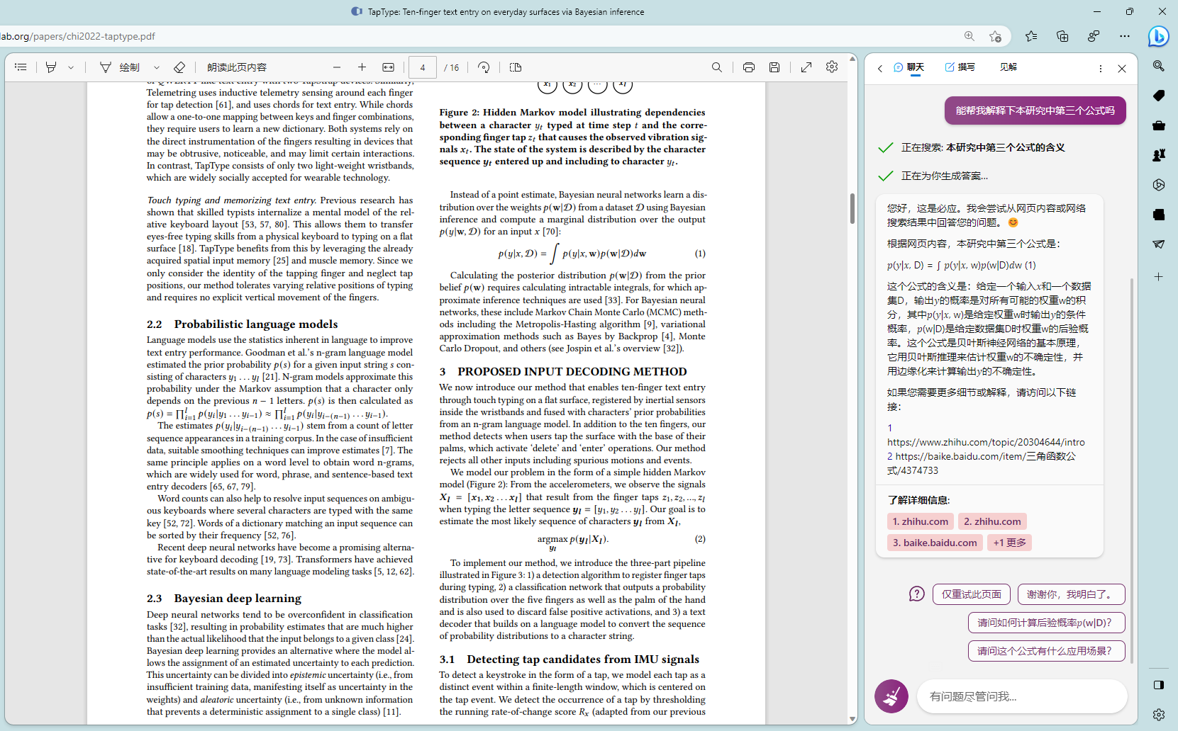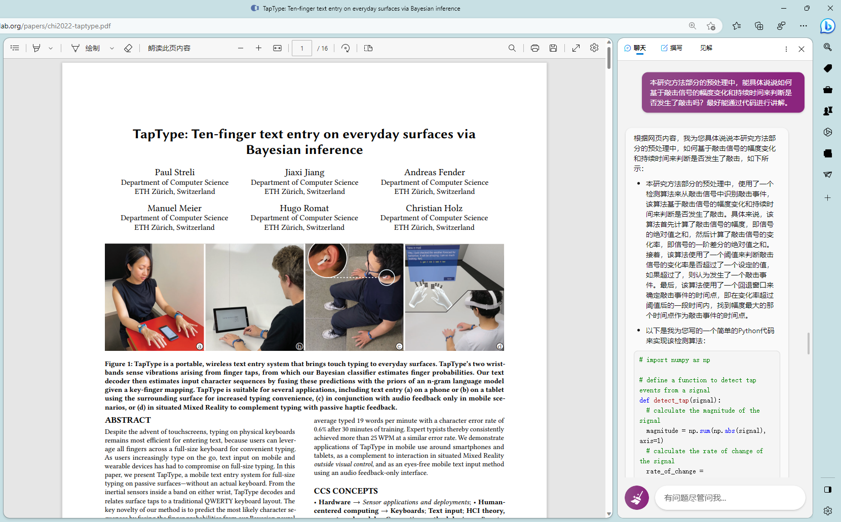 # 前言多说无益,直接上图# 技巧我是真的被震撼到了,这篇论文中我之前一直有一个点没搞懂,就是如何判断敲击事件的发生的,woc 今天让 new bing 去读,能给我详细的解释清论文的原理,还能给我写出示例代码 😱就给人一种感觉就是,有一个导师能给你详细的讲解论文。最后还尝试了下 new bing 能不能读公式,依旧牛逼,虽然公式找错了,但它是真能读懂公式啊最后想感慨就是,限制 new bing 或 chatgpt 的已经不是模型能力问题了,而是我的想象力和提问方式 😑 New Bing
